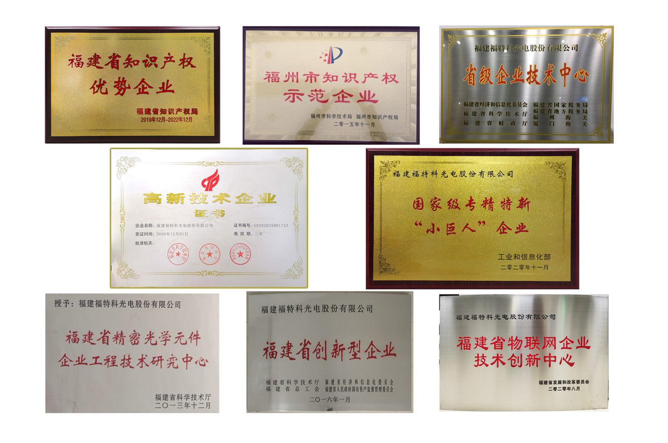 公司注重科技创新,是国家高新技术企业、国家级专精特新“小巨人”企业、福建省创新型企业、福建省物联网企业技术中心、福建省精密光学元件企业工程技术研究中心、福建省级企业技术中心。成立之初即建立了研发中心,拥有一个来自知名大学和研究所的光学、光电子、激光技术方面的专家组成的技术顾问团队。经过多年的技术攻关,福特科在光学元件、高清光学镜头设计和开发、光学镀膜技术、冷加工技术和精密光学部件集成技术等方面都取得了突破,先后承担了数项国家级、省、市级科技计划项目,并多次获得省市科学技术奖。公司总体光学技术水平处于国内领先地位。
